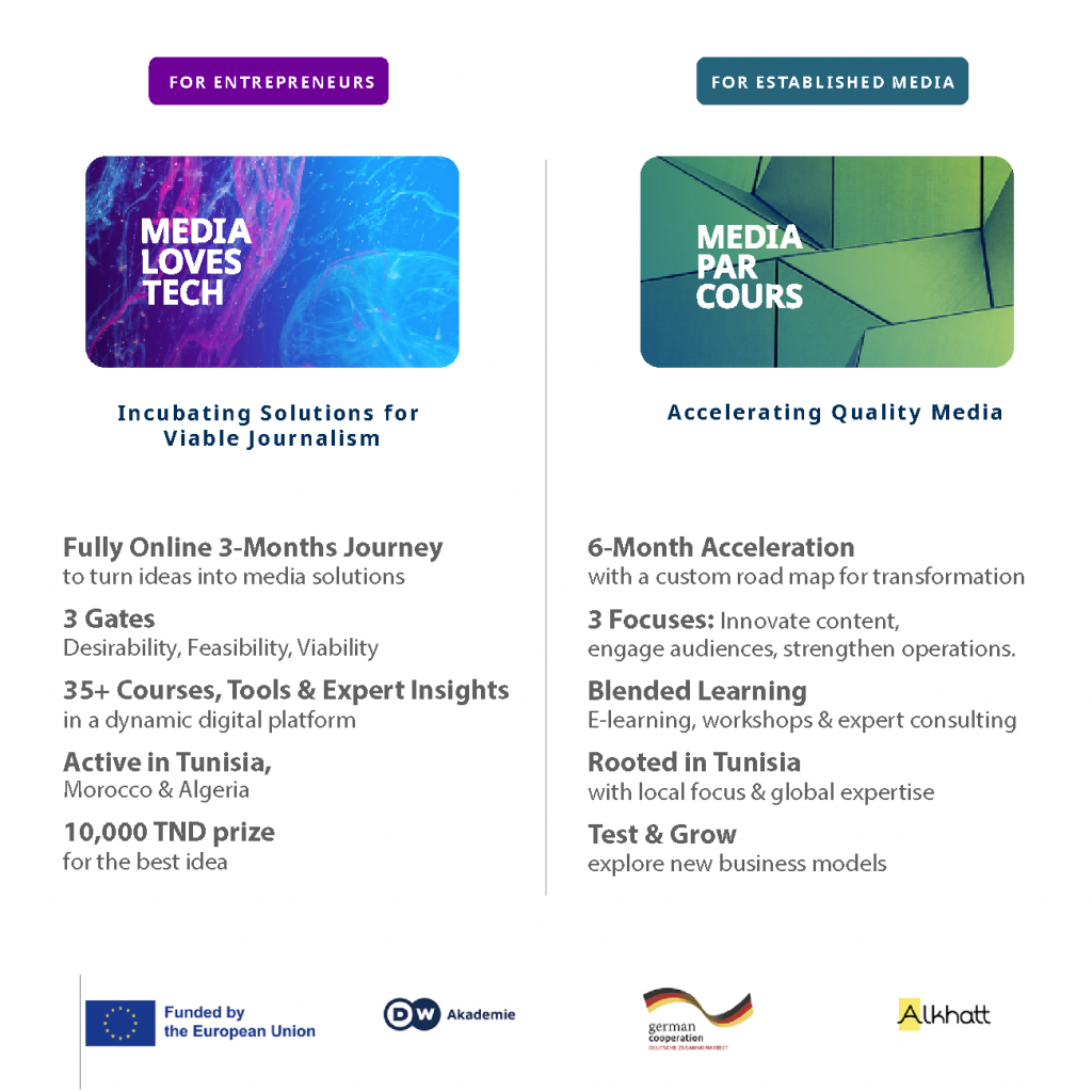 | MEDIA LOVES TECH MEDIA LOVES TECH is designed for media project leaders and technology-driven initiatives for journalism. The program supports teams from North Africa in testing the feasibility of their ideas and preparing them to become market-ready.Selected applicants begin with a three-month pre-incubation phase delivered entirely online, focused on structured learning through curated courses & online sessions. This is followed by an additional three-month incubation phase, combining access to the online platform with one-to-one, tailor-made expert support on demand, adapted to the specific needs of each project. The program is built to help teams move from concept to clarity — making informed decisions, refining their solutions, and laying solid foundations for future development. | MEDIA PARCOURS The SMART MEDIA ACCELERATOR acceleration program, MEDIA PARCOURS, runs over a period of nine months and is designed for established Moroccan and Tunisian media organizations — whether independent, associative, or private — seeking to strengthen and optimize their operations.MEDIA PARCOURS supports participating media by sharing proven practices and responding to their specific needs. Together with each organization, a tailored pathway is defined, combining expertise, capacity building, organizational support, and access to opportunities. We are looking for media actors committed to strengthening quality journalism and ready to engage in a structured growth journey. |